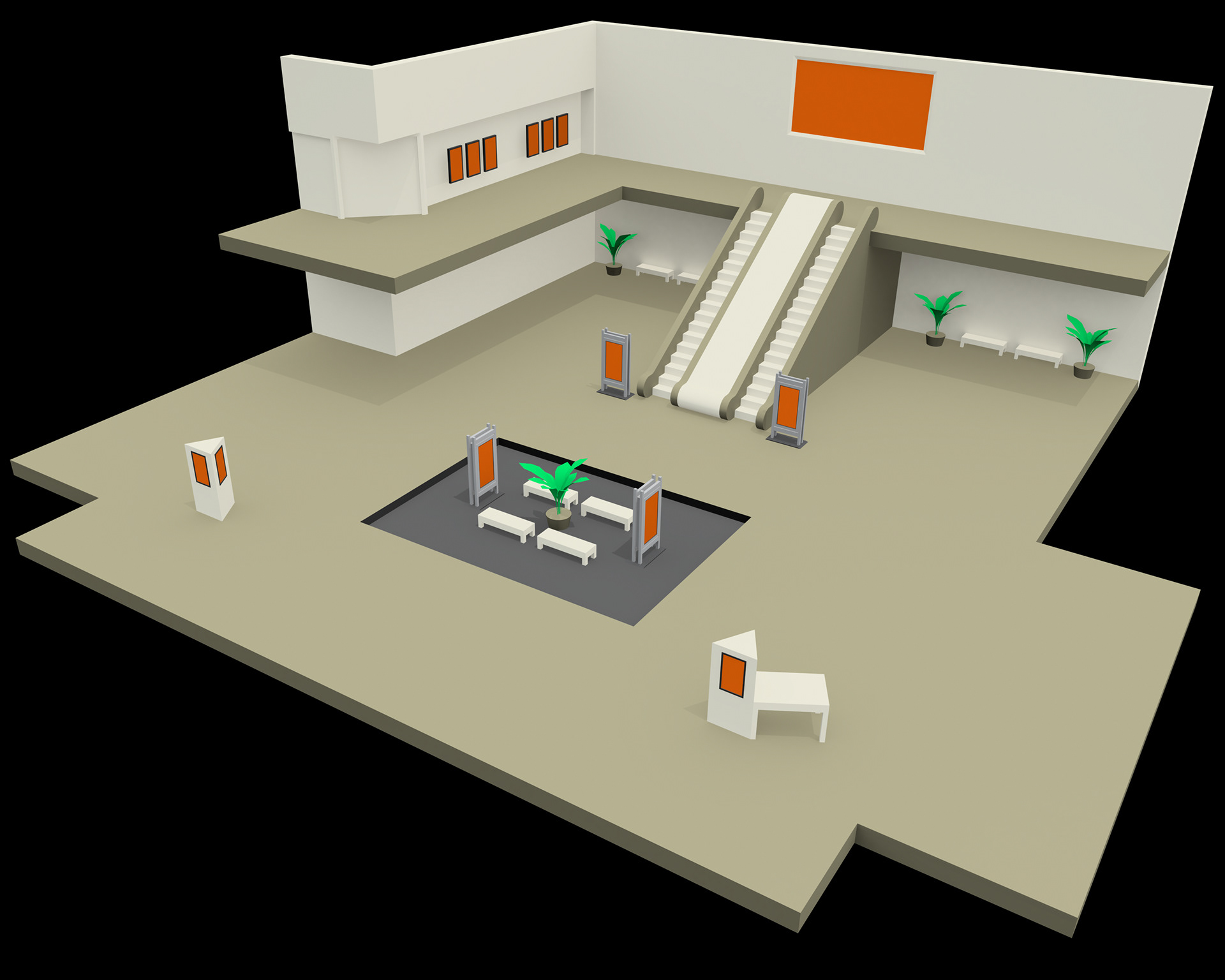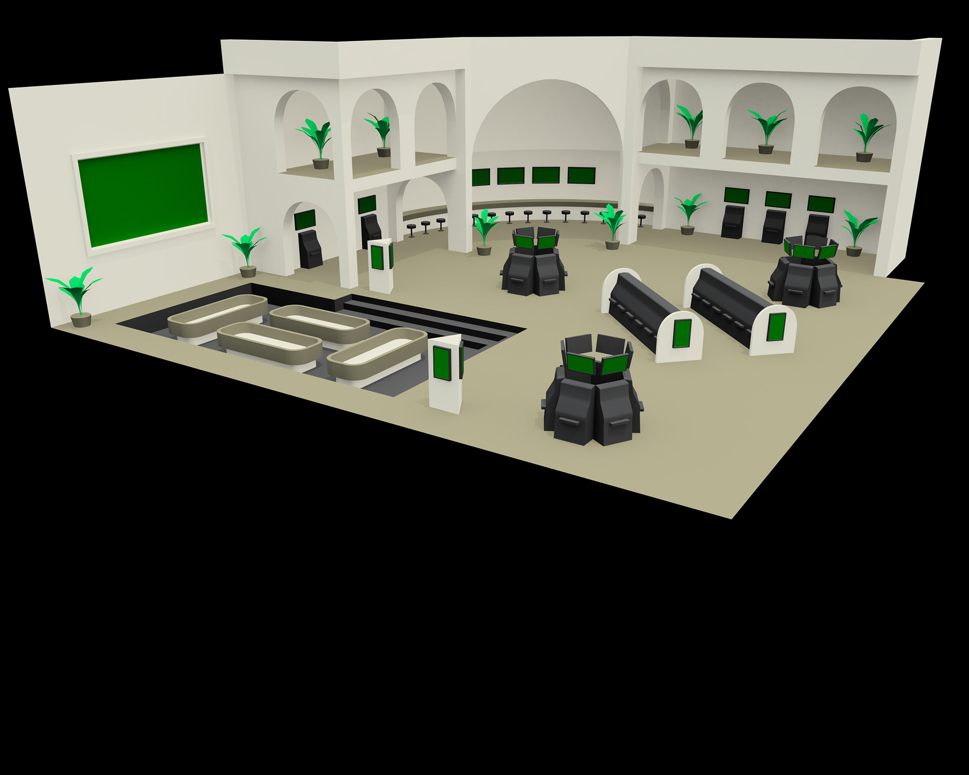 Interior visualizations of video display arrangements for Ant Hill Marketing.